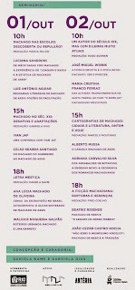 Em outubro vocês podem descobrir e redescobrir a cidade do Rio de Janeiro na companhia irônica e agradável de Machado de Assis e seus personagens. O evento Rio de Machado junta passeios guiados e seminários. Leiam com atenção a programação e boa viagem. Mais informações, é só baixar o aplicativo APP RIODEMACHADO.COM.BR