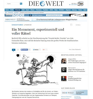 Meu desenho publicado recentemente (neste mês de setembro, dia 21- ontem) no jornal alemão "Die Welt" (O Mundo) para ilustrar uma matéria que fala de uma nova tradução da obra "Grande Sertão - Veredas" para a língua de Goethe.